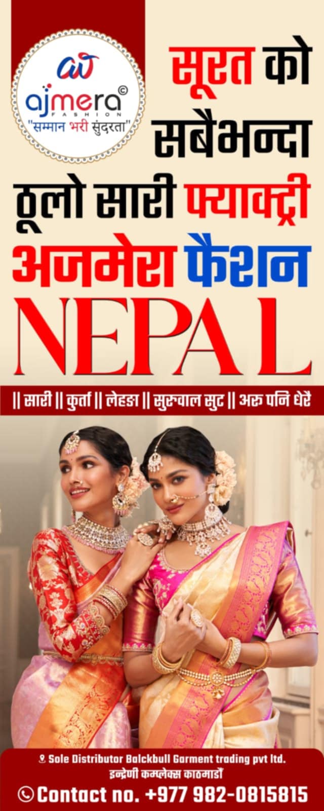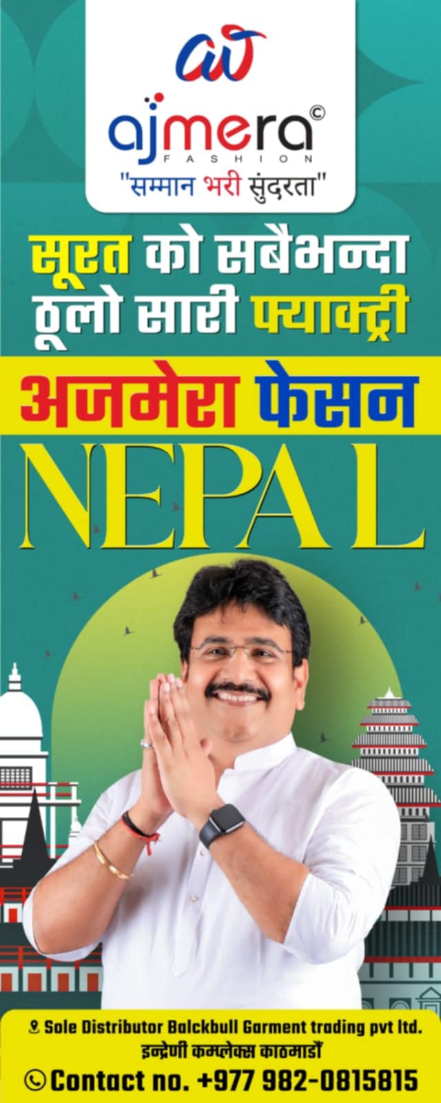 काठमाडौं, नेपाल — भारतको गुजरातस्थित न. १ टेक्सटाइल कम्पनी अजमेरा फैशन ईन्डियाले नेपालको इन्द्रेणी भवन बानेश्वरबाट बिधिवत बिक्री सुरु गरेको छ ।मासिक १० लाख उत्पादन क्षमता भएको कम्पनीका अध्यक्ष अजय अजमेरा भारतका प्रतिष्ठित कपडा उद्योगी हुन ।नेपालको आधिकारिक कार्यालय इन्द्रेणी भवन, नयाँ बानेश्वरको तेस्रो तल्लामा रहेको छ। यहाँबाट ग्राहकहरूले भारतकै फेक्ट्री दररेटमा सामान प्राप्त गर्न सक्नेछन्, ।भारतमा १९९२ मा स्थापना भएको कम्पनी गुजरातकै न १ कम्पनी हो ।१ लाख भन्दा बढी बिक्रेता भएको यस कम्पनीले ३० भन्दा बढी देशमा आफनो ब्यापार बिस्तार गरेको छ साथै १ अर्ब भन्दा बढी ग्राहकको मन जितेको कम्पनीको दाबी छ। नेपालमा ठुलो सख्यामा ग्राहक रहेपनी विभिन्न रुपमा नेपाल समान भित्र्याउने तर आधिकारिता नभएकोले अजमेरा फेसनले नेपालका लागी आधिकारिक बिक्रेता नियुक्त गरेको छ।