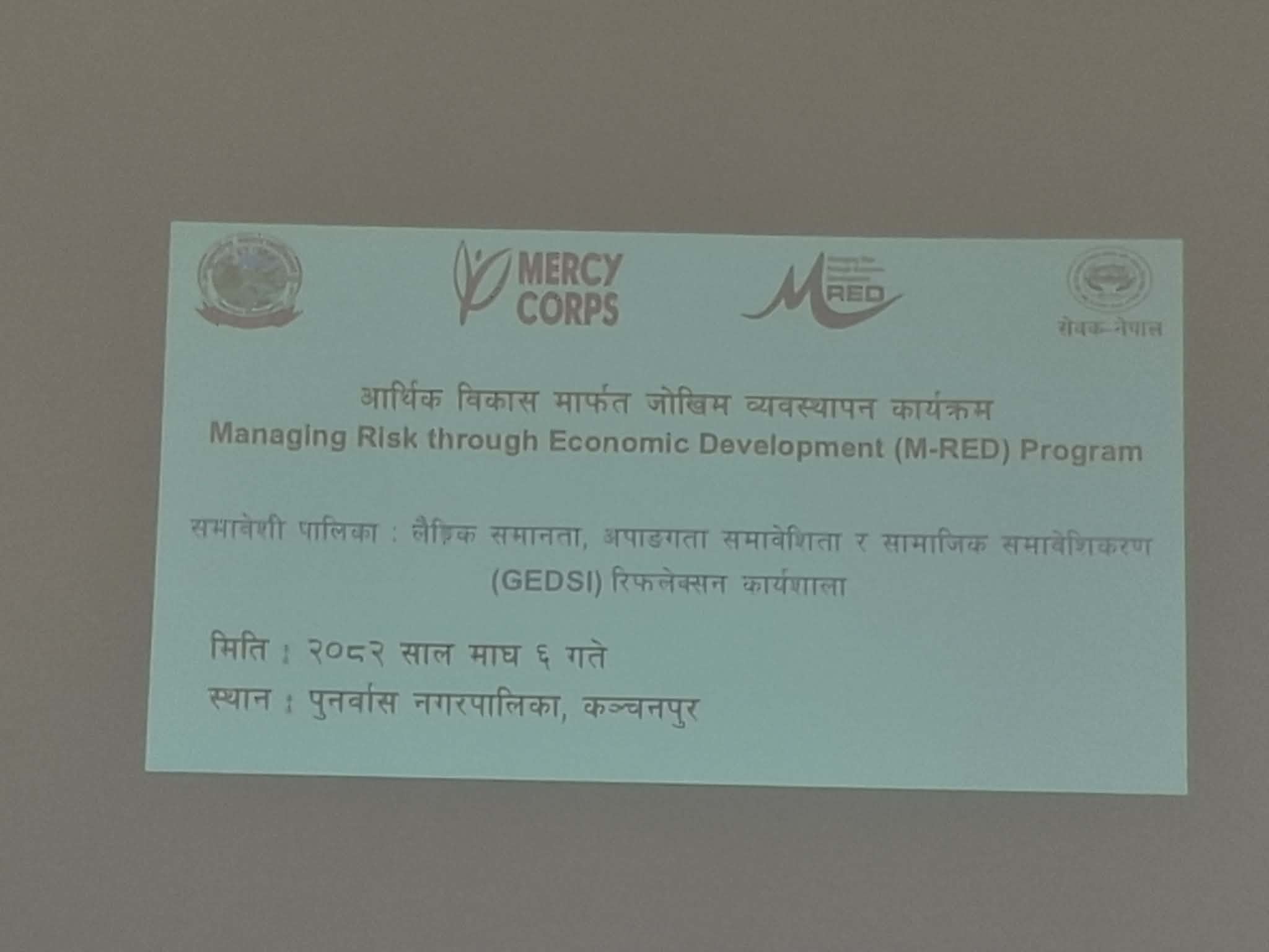 किशोर तामाङ,०६ माघ।कञ्चनपुरको पुनर्वास नगरपालिकामा नगर विपद् व्यवस्थापन शाखाको समन्वयमा मर्सिकोर नेपालद्वारा आर्थिक विकास मार्फत जोखिम व्यवस्थापन कार्यक्रम अन्तर्गत लैङ्गिक समानता, अपाङ्गता तथा सामाजिक समावेशीकरण (GESI)सम्बन्धी रिफ्लेक्सन कार्यशाला गोष्ठी सम्पन्न भएको छ ।