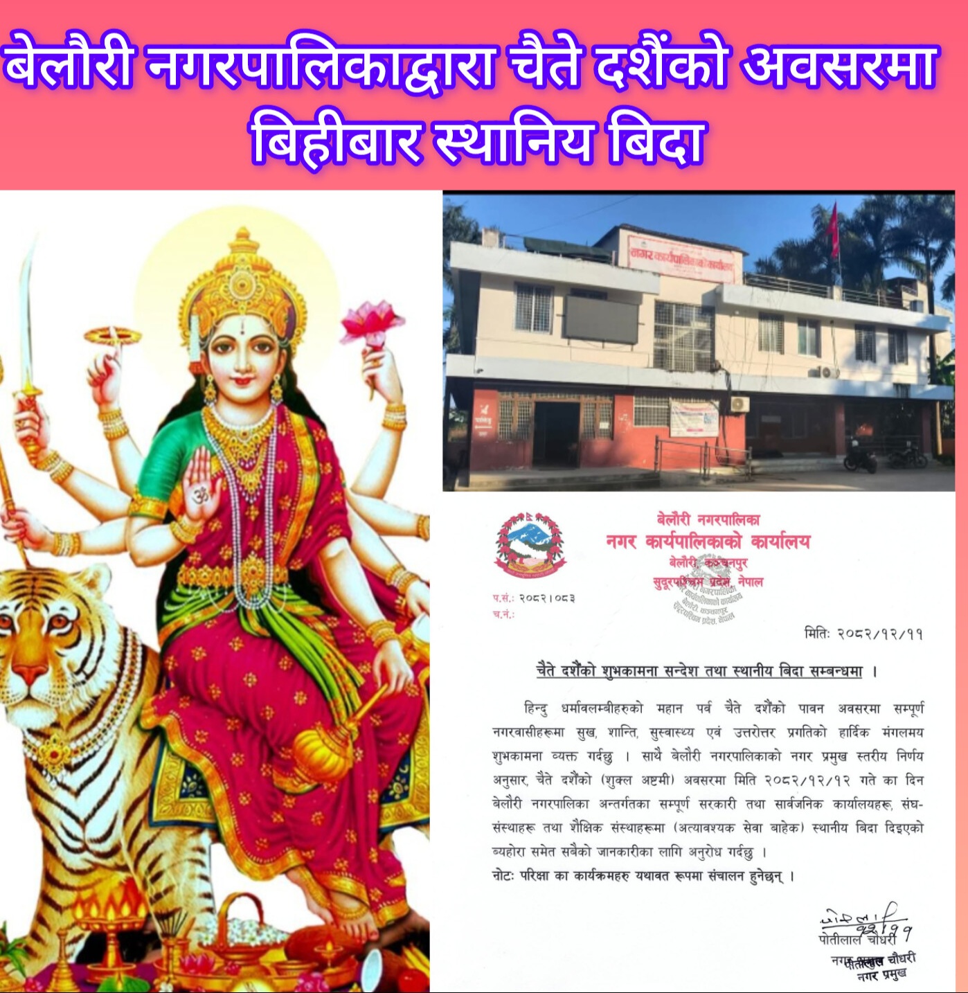 • बेलौरी ११ चैत्र। कञ्चनपुरको बेलौरी नगरपालिकाले हिन्दु धर्मावलम्बीहरूको महान पर्व चैते दशैंलाई लक्षित गर्दै बेलौरी नगरपालिका कार्यालयले बिहीबार स्थानीय बिदा दिएको छ।