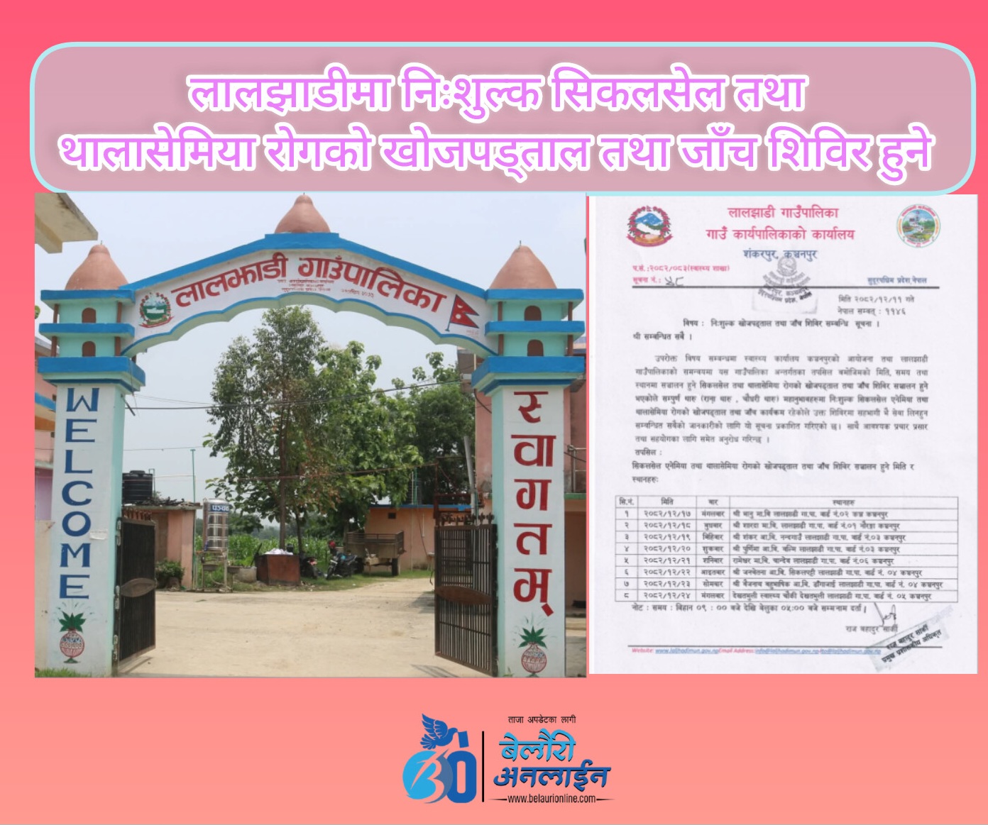 लालझाडी,१५ चैत्र। स्वास्थ्य कार्यालय कञ्चनपुरको आयोजना तथा लालझाडी गाउँपालिकाको समन्वयमा निःशुल्क सिकलसेल र थालासेमिया खोज पड्ताल तथा जाँच परीक्षण शिविर चैत्र १७ गतेदेखि २४ गतेसम्म लालझाडी गाउँपालिकाका विभिन्न वडाका विद्यालय तथा स्वास्थ्य संस्थामा सञ्चालन हुने भएको छ।