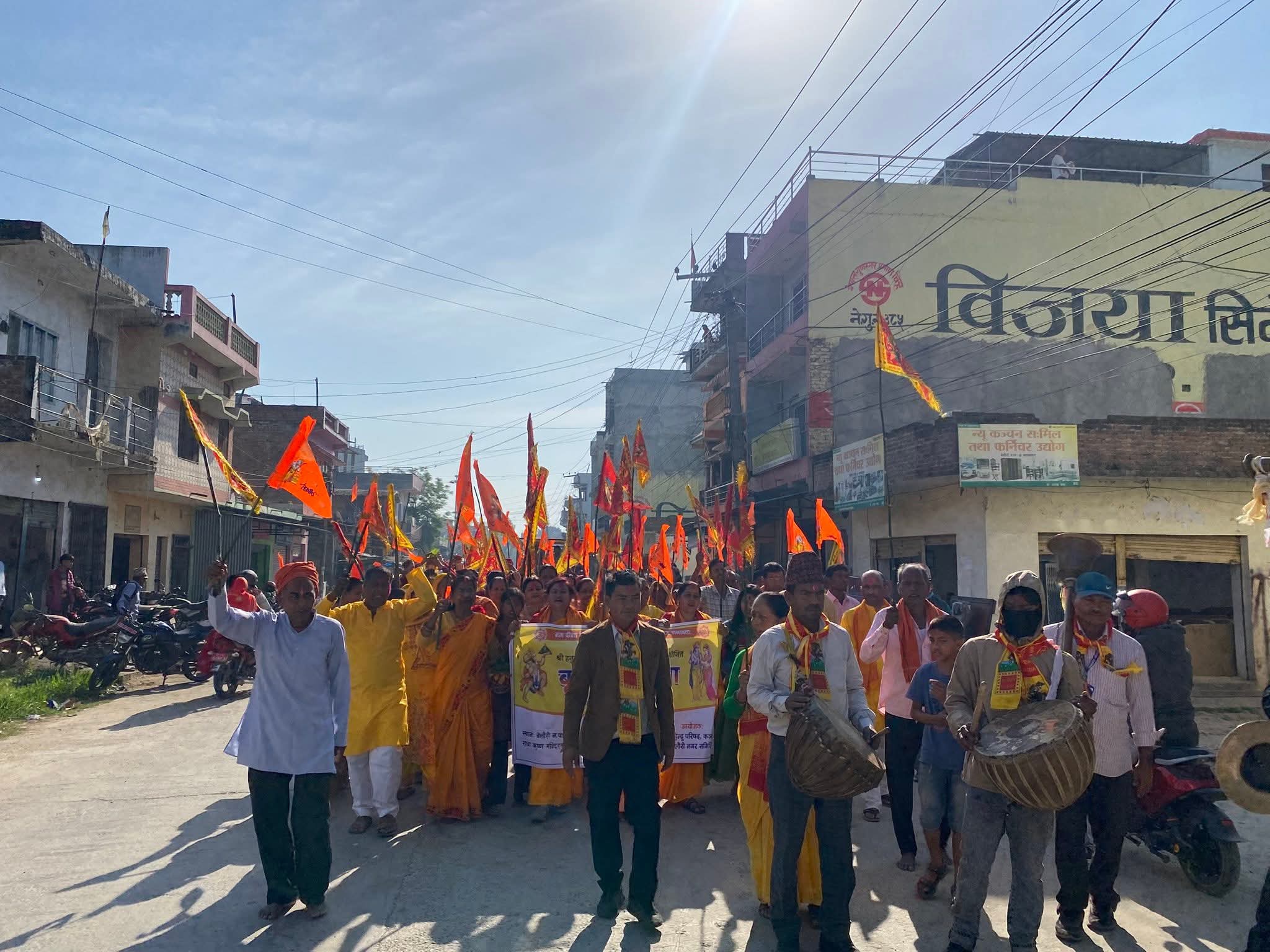 • बेलौरी, १९ चैत्र।कंचनपुरको बेलौरी नगरपालिका वडा नम्बर ४ रिछाहमा “जय श्री राम, जय बालाजी धाम” भन्ने नारासहित विश्व हिन्दु परिषद् नेपाल बेलौरीको आयोजनामा श्री हनुमान जन्मोत्सवको अवसरमा बिहीबार भव्य शोभायात्रा सहित मूर्ति प्राण प्रतिष्ठा सम्पन्न भएको छ।बिहान ८ बजे बेलौरी नगरपालिका वडा नम्बर ४ रिछाहा स्थित बालाजी धाम (श्री राधा कृष्ण मन्दिर अगाडि) बाट कार्यक्रम सुरु भई पञ्चेबाजा सहितको भव्य शोभायात्रा बेलौरी बजार हुँदै हात्तीबोझाबाट हनुमान भगवानको मूर्ति ल्याइ रिछाहा नजिकै रहेको बालाजी धाममा मूर्तिको प्राण प्रतिष्ठा गरिएको कार्यक्रम संयोजक विजयालक्ष्मी श्रेष्ठले जानकारी दिनुभयो। प्राण प्रतिष्ठा पश्चात् साँझ ५ बजे भण्डारा कार्यक्रम र राति भजन कीर्तनको कार्यक्रमको आयोजना गरिएको समेत कार्यक्रम संयोजक श्रेष्ठले बताउनुभयो।