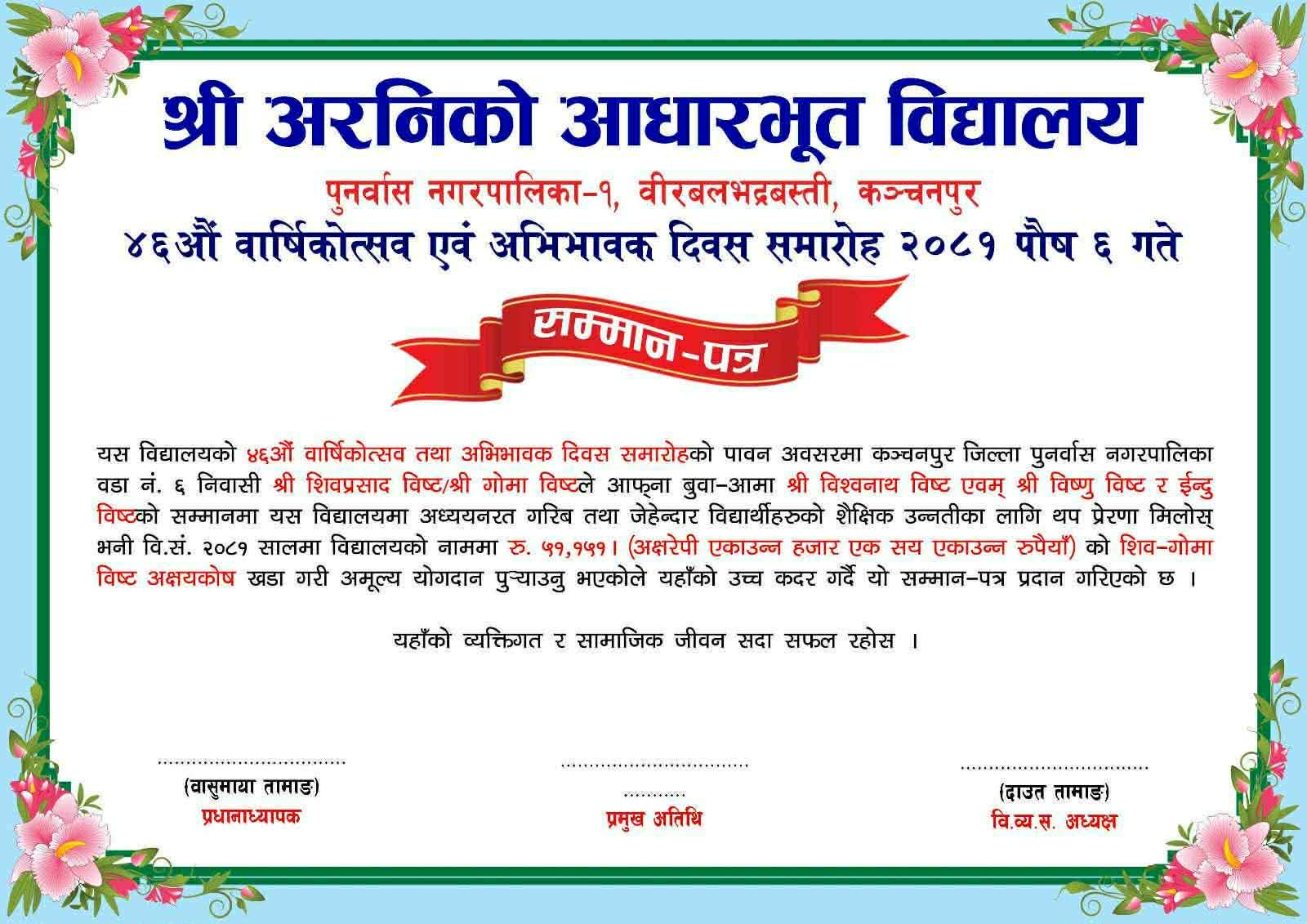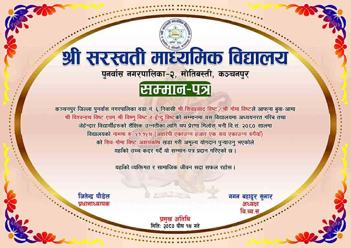 धनबहादुर बि क,२३ चैत्र।अमेरिकामा बसोबास गर्दै आएका नेपाली समाजसेवी शिव बिष्टले आफ्ना बुवा–आमाको सम्मानार्थ पुनर्वास क्षेत्रका १४ वटा विद्यालयमा अक्षयकोष स्थापना गरेका छन्।विभिन्न समयमा पुनर्वास का १४ सामुदायिक बिद्यालय मा ८ लाख ५० हजार ४४८ रूपैयाँ बराबरको अक्षयकोष स्थापना गरेका हुन ।