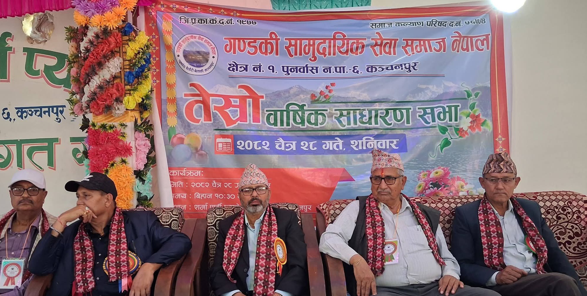 शनिबार पुनर्वास नगरपालिका ६ स्थित शर्मा पार्टी प्यालेस तथा अतिथि गेष्ट हाउसमा को शानदार सभाहलमा उक्त कार्यक्रम सम्पन्न भएको हो।जसमा समाजका सदस्यहरू, स्थानीय अगुवा तथा सरोकारवालाहरूको उल्लेखनीय उपस्थिति रहेको थियो। भेलामा संस्थाको वर्तमान गतिविधि, आगामी योजना तथा सामुदायिक विकासका विविध पक्षहरूमा विस्तृत छलफल गरिएको थियो।भेलाको प्रमुख उद्देश्य संस्थाका सदस्यहरूबीच आपसी समन्वय, सहकार्य र एकता अभिवृद्धि गर्नु रहेको थियो। यस प्रकारका भेलाले संस्थागत गतिविधिहरूलाई प्रभावकारी बनाउनुका साथै समुदायका आवश्यकताहरू पहिचान गर्न महत्वपूर्ण भूमिका खेल्ने विश्वास व्यक्त गरिएको छ।कार्यक्रममा वक्ताहरूले समाजमा रहेका समस्या तथा चुनौतीहरू समाधान गर्न सामूहिक प्रयासको आवश्यकता औंल्याएका थिए। साथै, शिक्षा, स्वास्थ्य, वातावरण संरक्षण तथा सामाजिक चेतना अभिवृद्धि जस्ता क्षेत्रमा संस्थाले अझ सक्रिय भूमिका खेल्नुपर्नेमा जोड दिइएको थियो।भेलाको महत्त्वबारे चर्चा गर्दै सहभागीहरूले यस्ता कार्यक्रमहरूले सदस्यहरूबीच विश्वास बढाउने, नयाँ योजना निर्माण गर्न सहयोग गर्ने तथा समाजप्रति उत्तरदायित्व बोध गराउने बताएका छन्। यस्तै, संस्थाको दिगो विकास र प्रभावकारी कार्यान्वयनका लागि नियमित रूपमा भेला आयोजना गर्नुपर्ने आवश्यकता पनि औंल्याइएको छ।कार्यक्रमको अन्त्यमा संस्थाका प्रतिनिधिहरूले आगामी दिनमा अझ सशक्त र व्यवस्थित रूपमा सामाजिक सेवा कार्यलाई अघि बढाउने प्रतिबद्धता व्यक्त गरेका थिए।निर्वाचन साधारणसभा समेत रहेको भेलाले पुन केशव प्रसाद तिमिल्सिना को संयोजकत्वमा १३ सदस्यीय नयाँ कार्य समिति चयन गरेको छ नव गठित समिति को उपाध्यक्षमा शिवलाल शर्मा,महिला उपाध्यक्षमा सत्यादेवि चापागाईं,महासचिवमा हरि प्रसाद अधिकारी,सचिव आनन्द सुवेदी,कोषाध्यक्षमा लक्ष्मण थापा सदस्यहरूमा बिष्णु प्रसाद तिवारी,जितबहादुर थापा , मकर थापामगर,कृष्णप्रसाद बगाले,दिनेश पण्डित,बसन्ती पौडेल र महेन्द्र बहादुर बिक,निर्विरोध चयन भएका छन।त्यसैगरी लेखा संयोजकमा गजेन्द्र प्रसाद ढकाल चयन भएका छन।नवनिर्वाचित समिति को कार्यकाल दुई बर्षको रहने जनाईएको छ।गण्डकी प्रदेशको विभिन्न जिल्लाबाट बसाइँ सरि पुनर्वासलाई कर्मथलो बनाउदै आएका हाल ४५० घरधुरी सङ्ख्या रहेको र ३ बर्ष अघि कञ्चनपुर जिल्ला प्रशासनमा विधिवत दर्ता भई संस्थागत कार्यक्रम सञ्चालन गर्दै आएको गण्डकी सामुदायिक समाज मा ३२ जना आजिवन सदस्य रहेको समाजका अध्यक्ष केशव प्रसाद तिमिल्सिनाले जानकारी दिनुभयो । समाजका अध्यक्ष केशव प्रसाद तिमिल्सिनाको सभापतित्वमा भएको कार्यक्रमका प्रमुख अतिथि पुनर्वास नगरपालिका प्