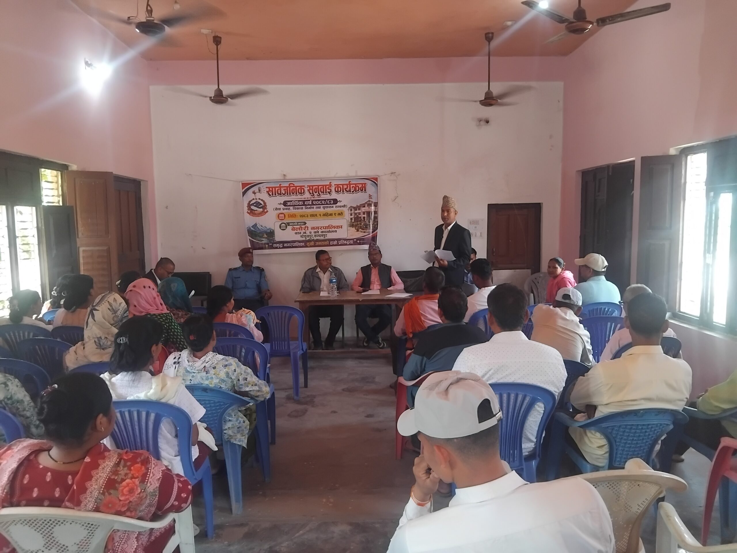 • माधब पौडेल,०९ वैशाख। कञ्चनपुरको बेलौरी नगरपालिका वडा नम्बर २ मा बुधबार आर्थिक वर्ष २०८१/०८२ र २०८२/०८३ को अर्धवार्षिक सार्वजनिक सुनुवाइ कार्यक्रम सम्पन्न भएको छ।वडाध्यक्ष कलवीर चौधरीको अध्यक्षता, प्रमुख अतिथि बेलौरी नगरपालिकाका नगर उपप्रमुख जोगराम चौधरी, वर्तमान तथा निवर्तमान वडा सदस्य, वडा सचिव नमराज पौडेल,नगरपालिका अन्तर्गतका स्वास्थ्य चौकी,सामुदायिक र संस्थागत विद्यालयका प्रधानाध्यापक सुरक्षा निकायका प्रतिनिधि, बजार व्यवस्थापन समिति विभिन्न कृषि शाखाका प्रतिनिधि,भलमन्सा, पधनाहरुको सहभागिता रहेको थियो।कार्यक्रममा वडा सचिव नमराज पौडेलले गत आर्थिक वर्षमा सम्पन्न भएका काम तथा चालु आर्थिक वर्षका योजनाबारे जानकारी दिनुभएको थियो। वडाध्यक्ष चौधरीले गत वर्ष २३ लाख ३३ हजार रुपैयाँ बजेटबाट विकास निर्माणका काम गरिएको र चालु आर्थिक वर्षका लागि ३४ लाख रुपैयाँ बजेट विनियोजन भएको उल्लेख गर्नुभयो। उक्त बजेटबाट बिउबिजन खरिद र आँखा शिविर सम्पन्न भइसके पनि विकास निर्माणका केही काम अझै अघि बढ्न नसकेको बताउँदै कामलाई समयमै सम्पन्न गरी भुक्तानी लिन हुन आग्रह गर्नुभयो।